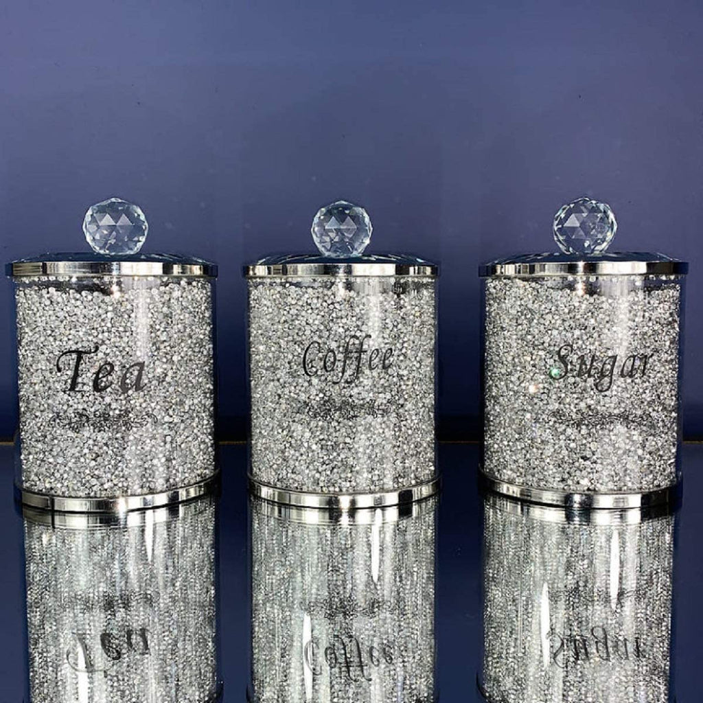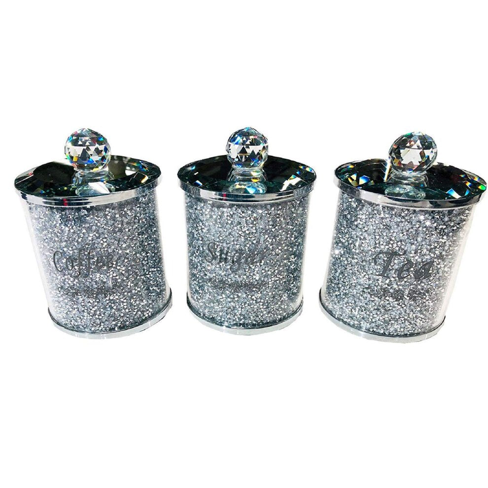 Styled and marked for tea, coffee and sugar, these three kitchen canisters stand 13 centimetres tall and 10 centimetres wide. The eye-catching crystal handles and reflective silver lids make this a set of three storage jars that simply outclass the competition - all while glistening with crushed diamonds.