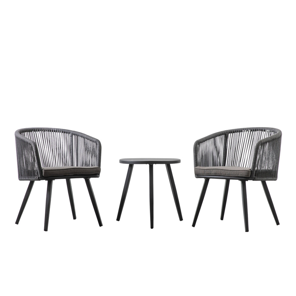 This lovely 2 Seater Bistro/Tea Set offers two chairs and a side table, making it ideal for smaller spaces and cosy garden corners. The table and chair frames are made from powder coated aluminium, with weatherproof rope weave for the chair seats and showerproof scandi-style cushions in a coordinating colour for added comfort. A matching dining set is also available.