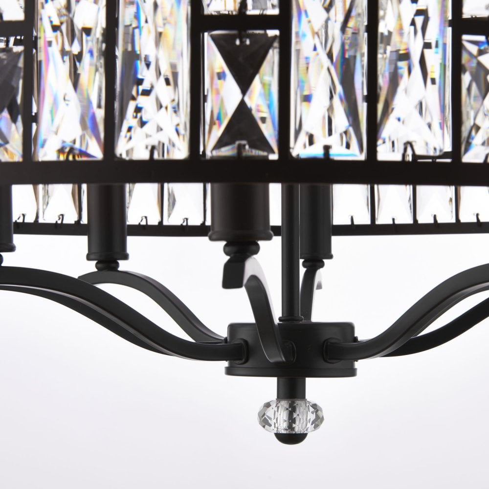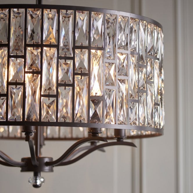 An 8 light cylindrical ceiling pendant with clear crystal detailing and a dark bronze effect finish. Suitable for use with LED lamps and dimmable. Available in 2 sizes