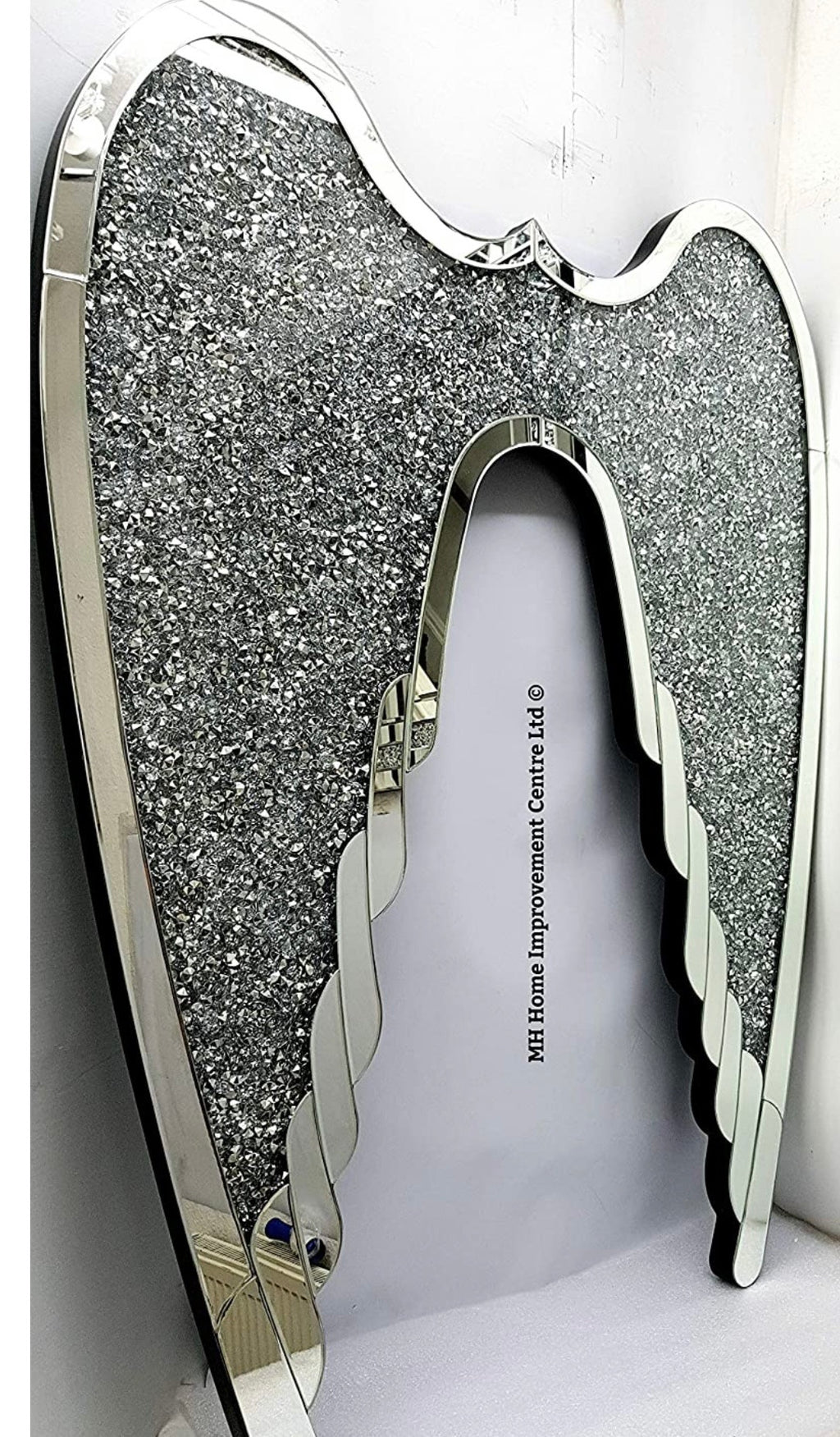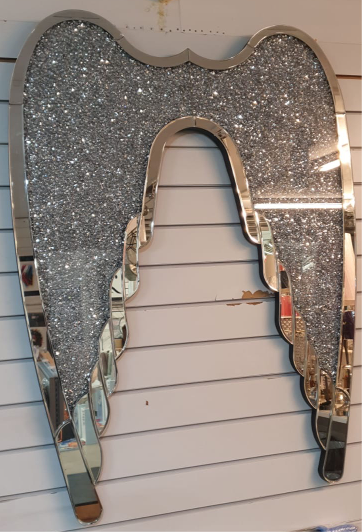 A touch of the past blended with the new. Wall Hung Angel Wings in Sparkly Silver Diamond Crush. Features & Details. The two wings are joined together as one unit. Hung by two triple Screwed Wall Brackets. Outline made of Silver Mirrored Bevelled Glass Panels. Sparkly Diamond Crush Crystal Effect on Silver Foil Centre. Height 120cm Width Width 90cm Depth 3.8cm