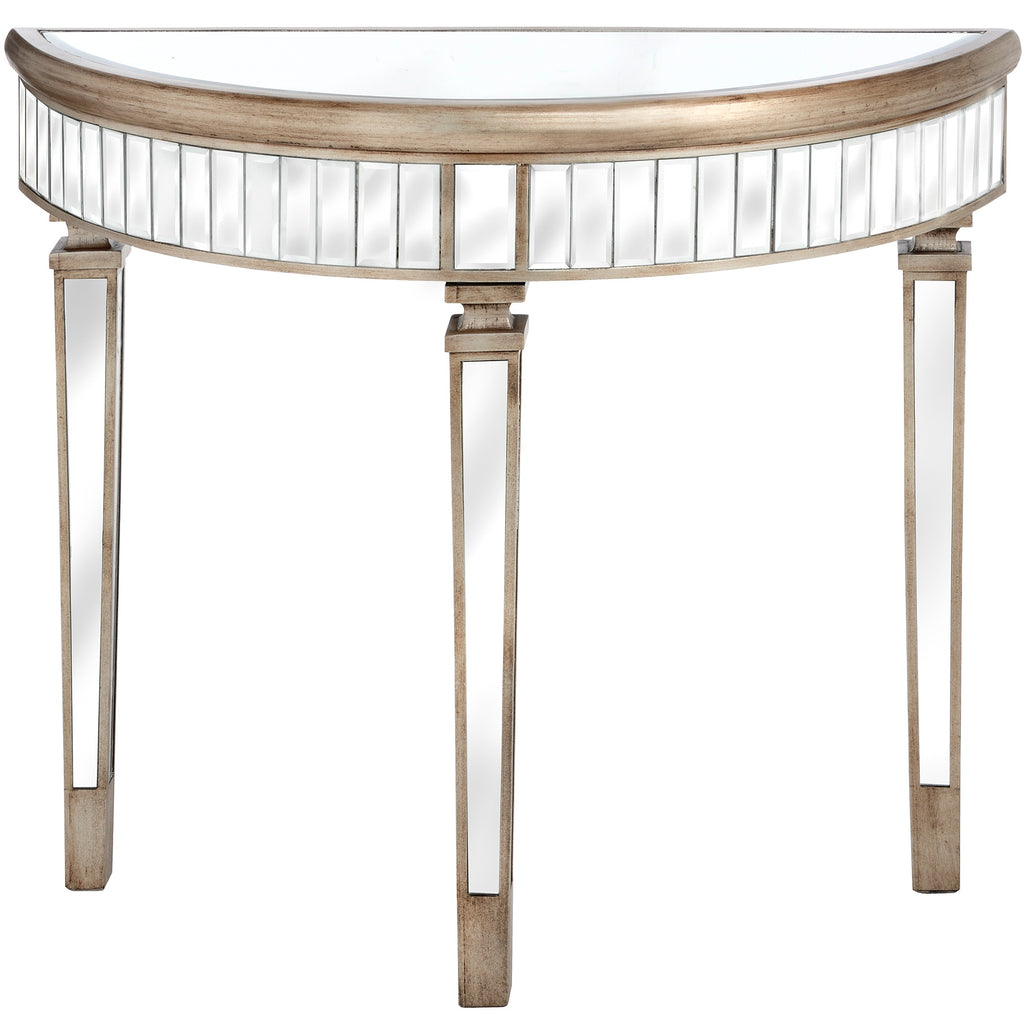 This is the Belfry Collection Half Moon Mirrored Table, handcrafted to upmost perfection the Belfry Collection Brings World Class interior into your home. This Stunning Mirrored Piece features champagne detailing adding a timeless luxury to your home. Beautifully made from the finest crystal glass, it features a half moon display surface with bevelled edges, art deco detailing, and ornate legs that will bring sparkle and shine to every room. An exceptional mirrored table, it is a real statement piece.
